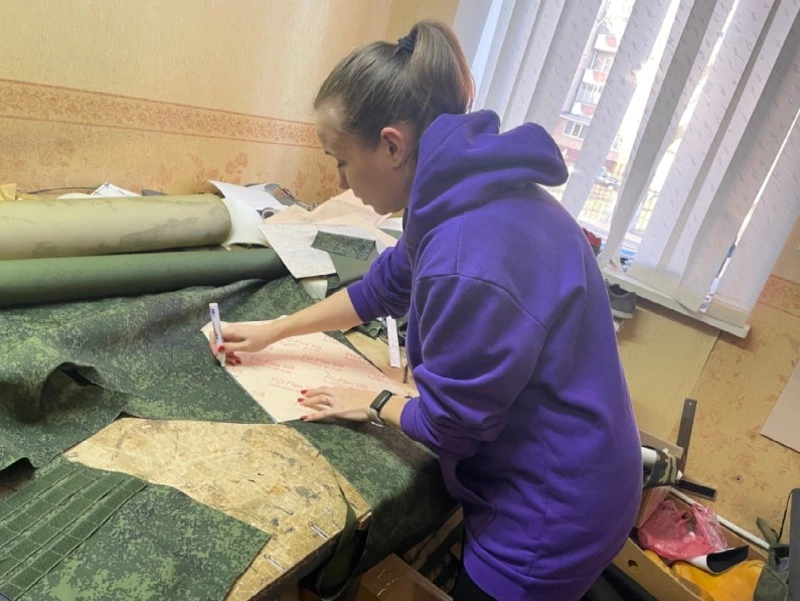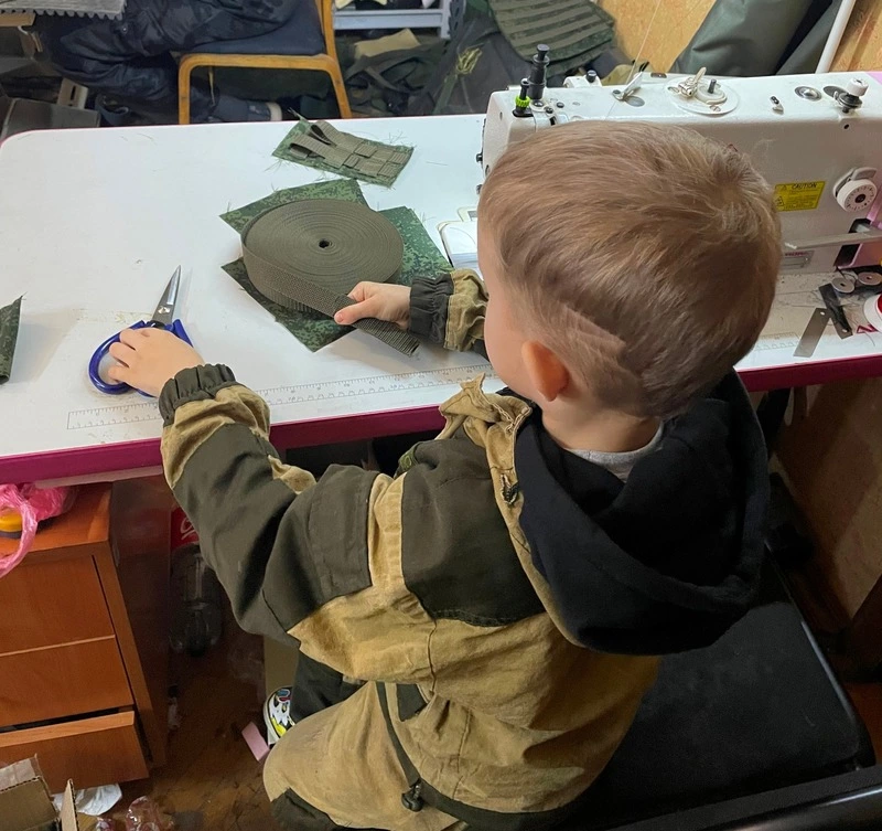 К работе подключились супруга Арина и старший сын Богдан. Арина стоит за столом раскроя, ловко выкраивая детали будущего жилета по шаблону, а первоклассник Богдан нарезает хлястики для подсумков по готовой мерке.