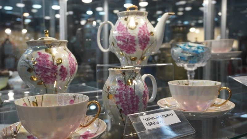 Посетителям представлены образцы из коллекции «Посуда»: изделия «Товарищества производства фарфоровых, фаянсовых и майоликовых изделий Матвея Сидоровича Кузнецова» Дулевского фарфорового завода, Императорского фарфорового завода.