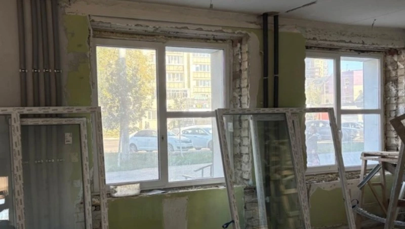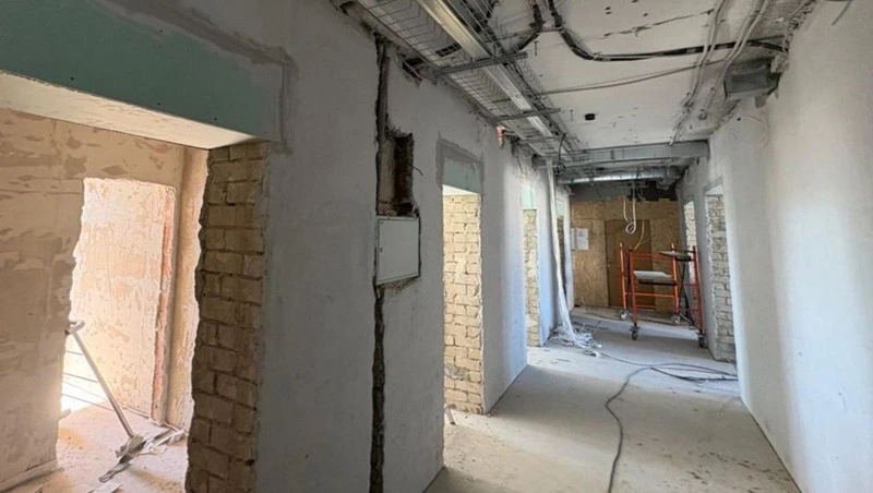 В настоящее время в здании выполняется комплекс строительно-монтажных работ. Специалисты занимаются устройством перегородок, усилением проёмов, оштукатуриванием стен и заливкой стяжки полов. Параллельно ведётся замена оконных блоков.