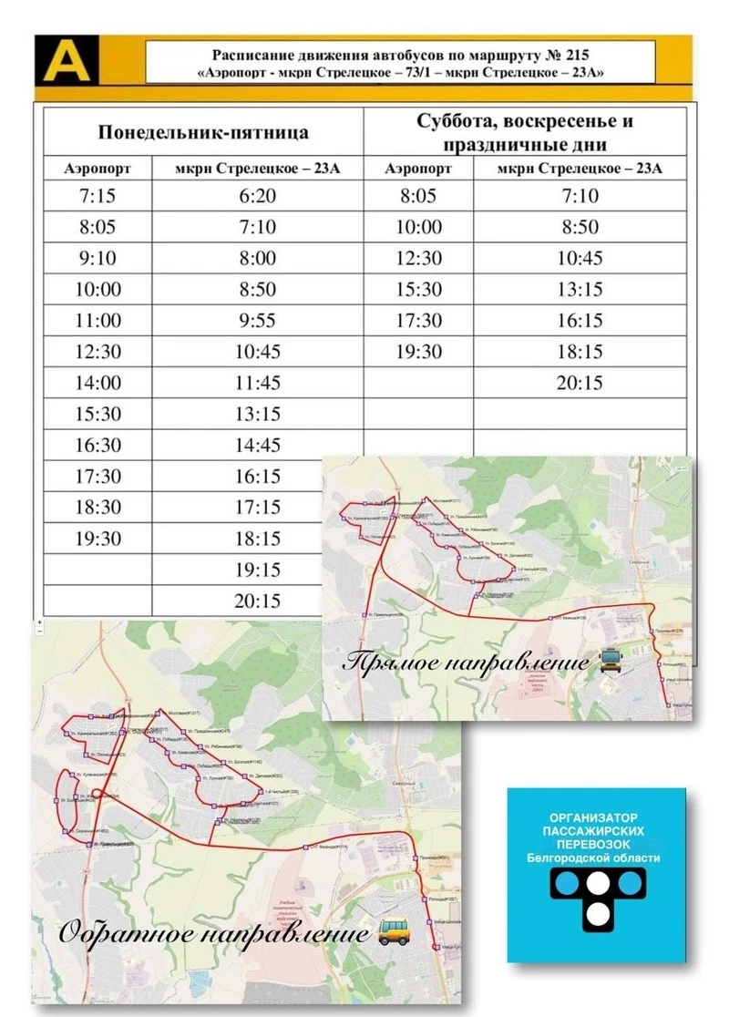 С 13 октября 2025 года в Белгородской агломерации начнёт работу новый маршрут общественного транспорта № 215 «Аэропорт — микрорайон Стрелецкое — 73/1 — микрорайон Стрелецкое — 23А». Об этом сообщает Организатор пассажирских перевозок региона.