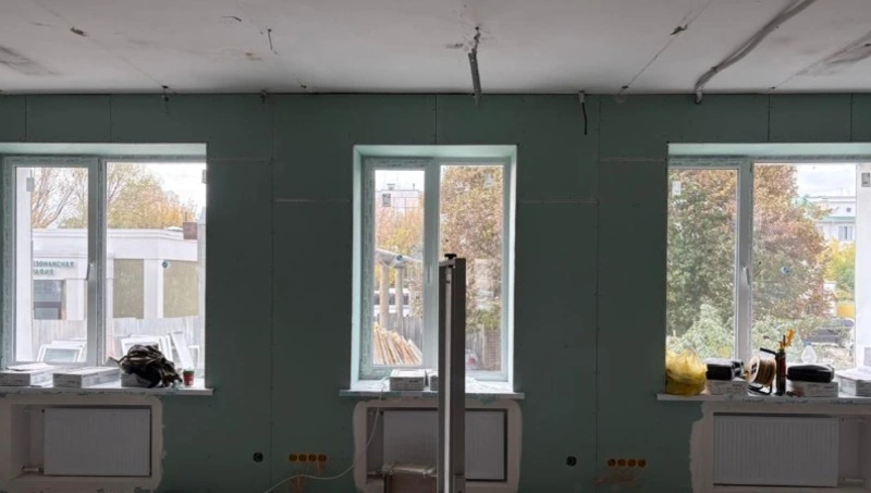 Сейчас строители одновременно ведут несколько видов работ: монтируют системы водоотведения и вентиляции, занимаются оштукатуриванием стен и стяжкой полов, устанавливают новые оконные блоки. Параллельно идёт устройство слаботочных систем, монтаж потолков и дверных блоков, покраска стен и установка ограждений на лестницах.