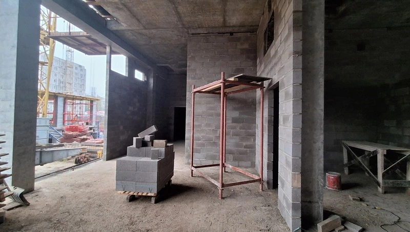В блоке Б завершается монтаж колонн цокольного этажа. Строители заняты устройством перекрытий, чернового пола, а также утеплением стен и наружной гидроизоляцией. Начато возведение стен и колонн первого этажа.