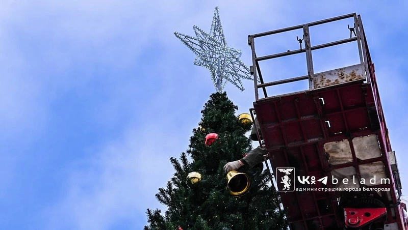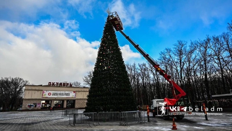 В Белгороде полным ходом идут работы по созданию новогодней атмосферы. У культурного центра «Октябрь», на одной из самых популярных прогулочных площадок города, завершился монтаж каркаса и искусственной хвои главной ёлки.
