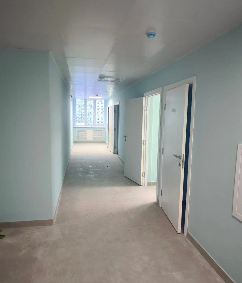 Подрядчики завершают отделку фасада и входной группы. Внутри здания устанавливают межкомнатные двери и монтируют внутренние инженерные сети.