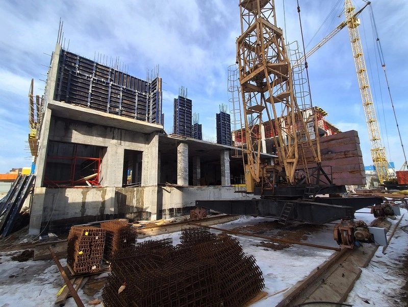 В блоке Б работы перешли в фазу возведения каркаса верхних этажей. Здесь ведётся заливка перекрытий пятого уровня и монтаж монолитных стен. Параллельно в этом секторе началось устройство внутренних перегородок на первых трёх этажах здания.